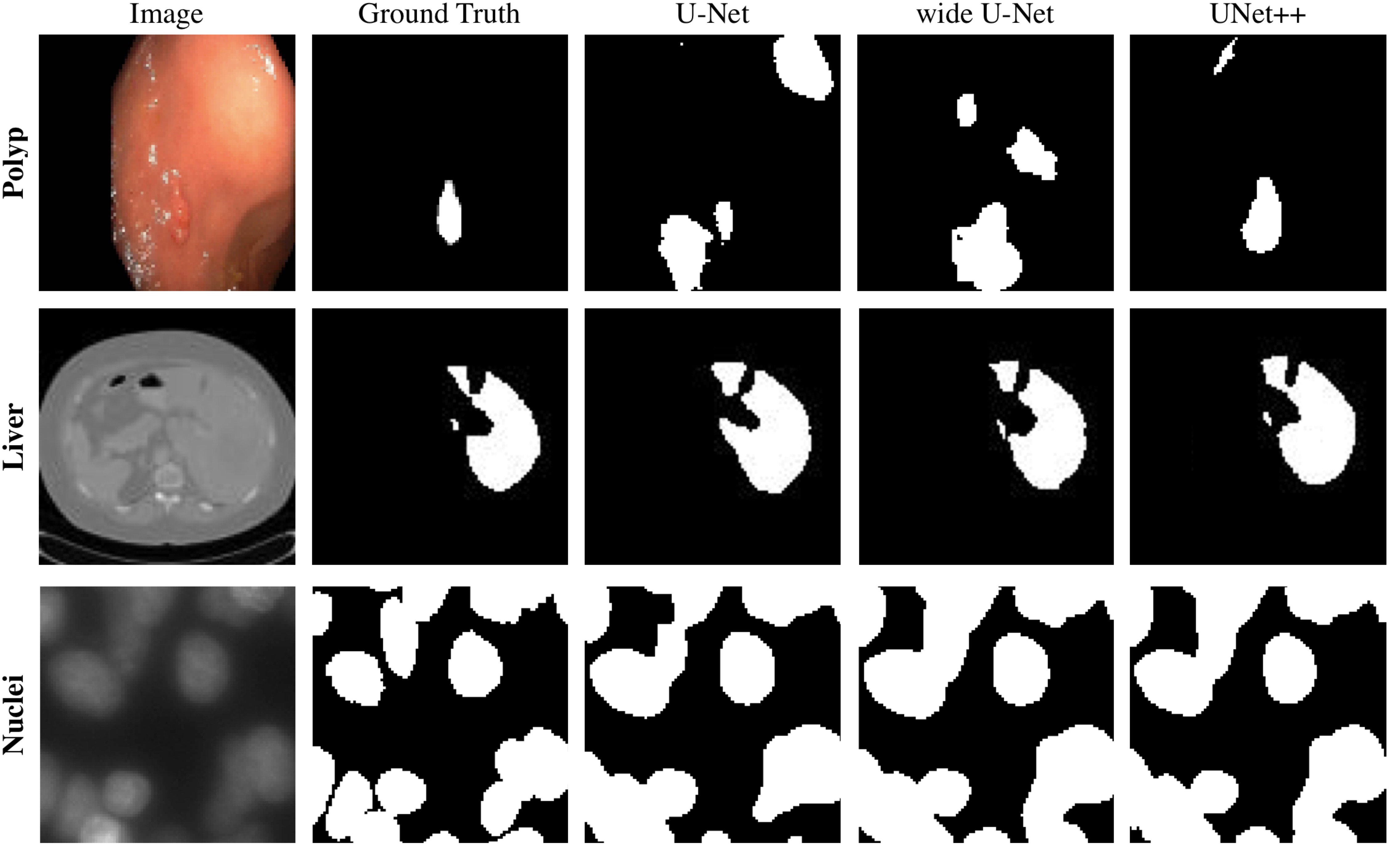 The authors evaluated UNet++ on multiple medical segmentation tasks (lung nodules, colon polyps, liver, etc.).