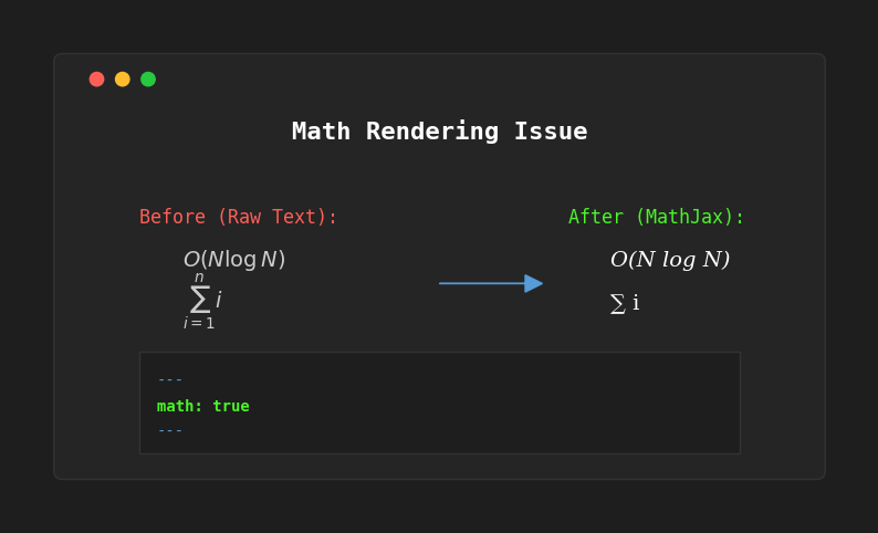 After migrating my algorithm posts to Jekyll Chirpy, I noticed a glaring issue. Complex mathematical formulas, which are essential for explaining time complexity like $O(N \log N)$ or recurrence relations, were displaying as raw text.
